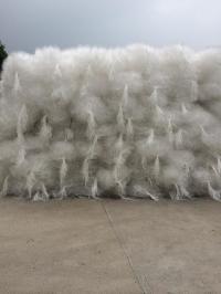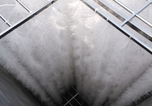 該填料篩選了聚烯烴類和聚酰胺中的幾種耐腐、耐溫、耐老化的優(yōu)質(zhì)品種,混合以親水、吸附、抗熱氧等助劑,采用特殊的拉絲,絲條制毛工藝,將絲條穿插固著在耐腐、高強度的中心繩上,絲條布置應(yīng)呈立體狀,絲條表面應(yīng)有微波紋,由于選材和工藝配方精良,剛?cè)徇m度,使絲條呈立體均勻排列輻射狀態(tài),制成了懸掛式立體彈性填料的單體,填料在有效區(qū)域內(nèi)能立體全方位均勻舒展?jié)M布,使氣、水、生物膜得到充分混滲接觸交換,生物膜不僅能均勻地著床在每一根絲條上,保持良好的活性和空隙可變性,而且能在運行過程中獲得愈來愈大的比表面積,又能進行良好的新陳代謝,這一特征與現(xiàn)象是目前其他填料不可比擬的。